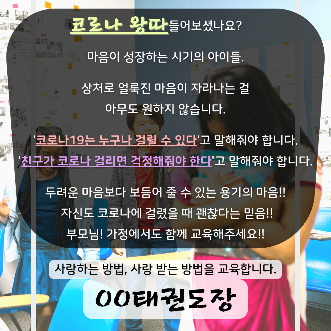 코로나 걸려도 괜찮다고 걱정해주는 교육을 부모님과 수련생에게 진행 한다면 지도진이 걸리더라도 응원의 메시지를 받을 수 있다고 생각합니다.