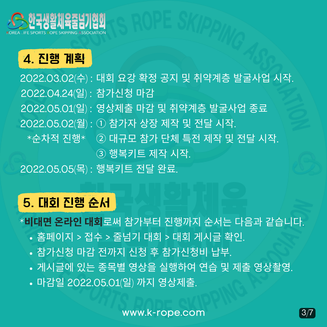 자세한 내용은 홈페이지 > 접수 > 줄넘기 대회 접수 대회요강을 확인해주세요.