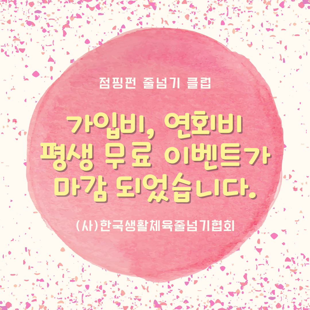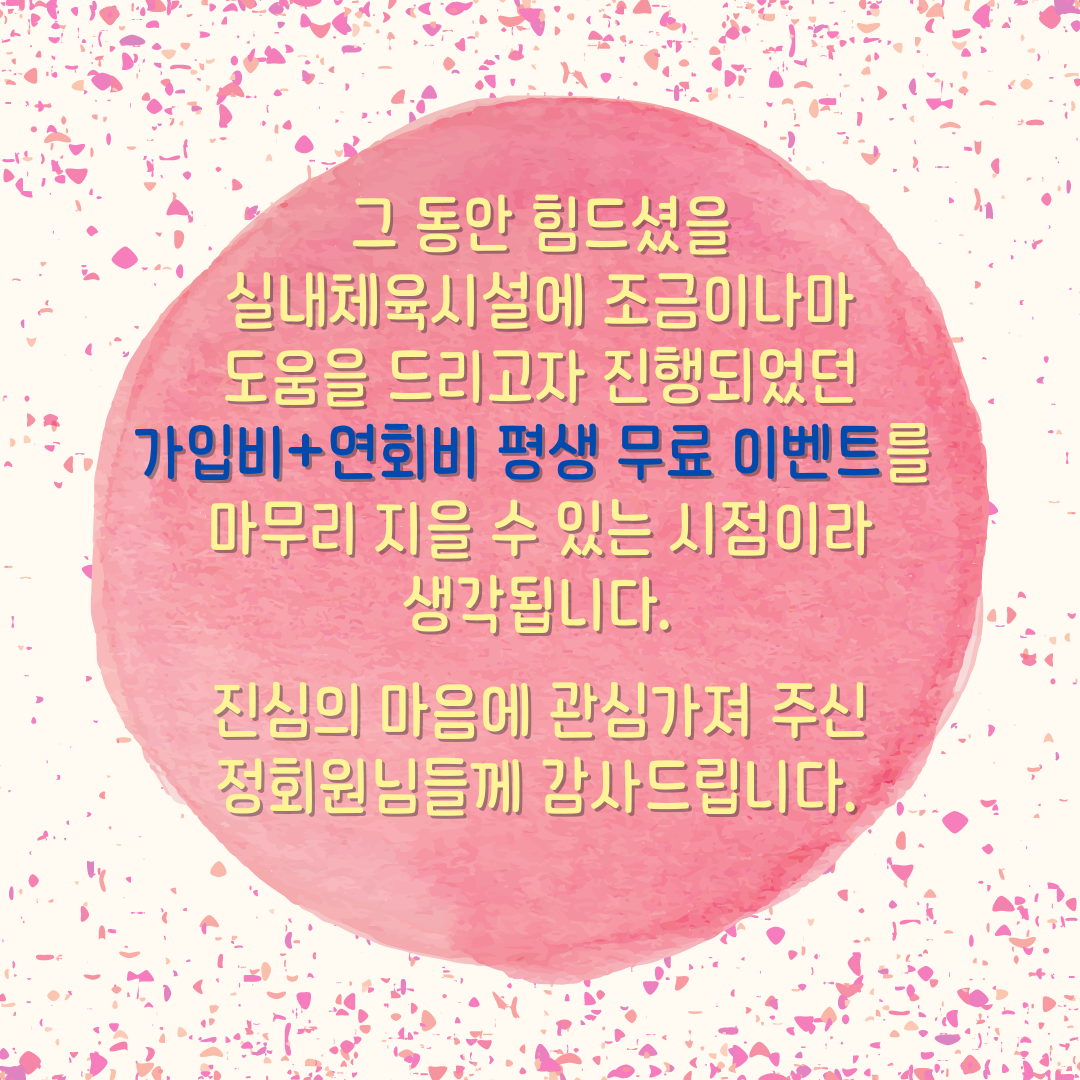 ????그 동안 힘드셨을 실내체육시설에 조금이나마 도움을 드리고자 진행되었던 "가입비+연회비 평생 무료 이벤트"를 마무리 지을 수 있는 시점이라 생각됩니다.